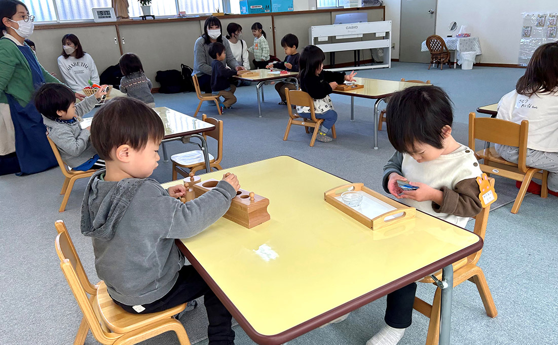 モンテッソーリ教具に触れたり、絵本の読み聞かせ・リトミック・園庭で遊び、五感をしっかりと使い、ひとりでできることを繰り返すことで心と体を創る土台ができます。